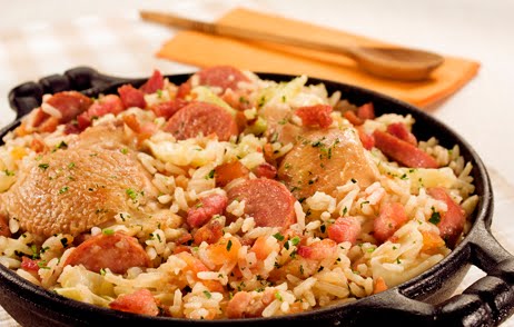 2 Aqueça uma panela grande, frite o bacon em sua própria gordura, junte as sobrecoxas de frango e refogue até ficarem douradas. Acrescente a linguiça, a cebola e frite por alguns minutos. Junte os tomates, o repolho, o arroz e tempere com o sal restante.